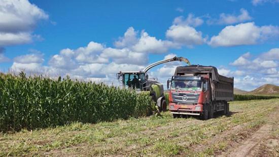 贺斯格乌拉牧场种植的青贮玉米同样迎来丰收。青贮收割机穿梭田间,饱满的玉米秸秆被粉碎后直接装入运输车,送往青贮窖。“以前人工收割,一天最多100亩;现在有农机帮忙,500亩地一天半就能搞定!”贺斯格乌拉牧场综合服务站负责人刘青龙介绍,今年500多亩青贮玉米实收3吨,能满足养殖场800多头肉牛冬季饲料需求,机械化让秋收效率翻倍,农牧民不用再为“抢收”发愁。